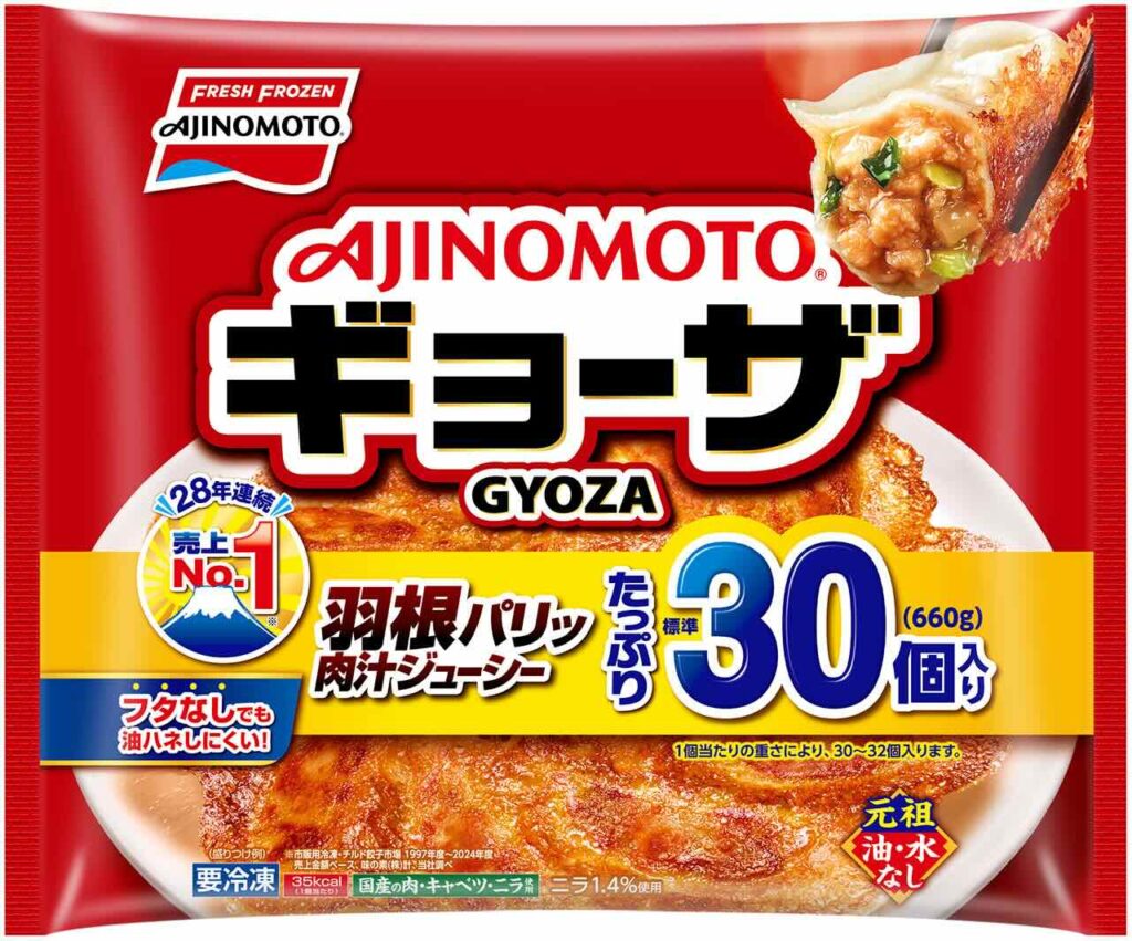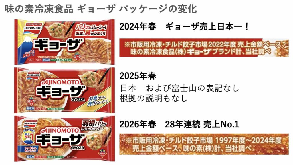 ちなみに味の素ギョーザは2025年春から今まで記載していた「ギョーザ売上日本一」と「富士山」の記載がなくなっていましたが、この2026年春のパッケージから復活しました。今後は味の素ギョーザ単品ではなく、「AJINOMOTO BRANDギョーザ」として味の素の餃子全体でブランドイメージ、売上を高めていく考えのようです。今後も楽しみですね!