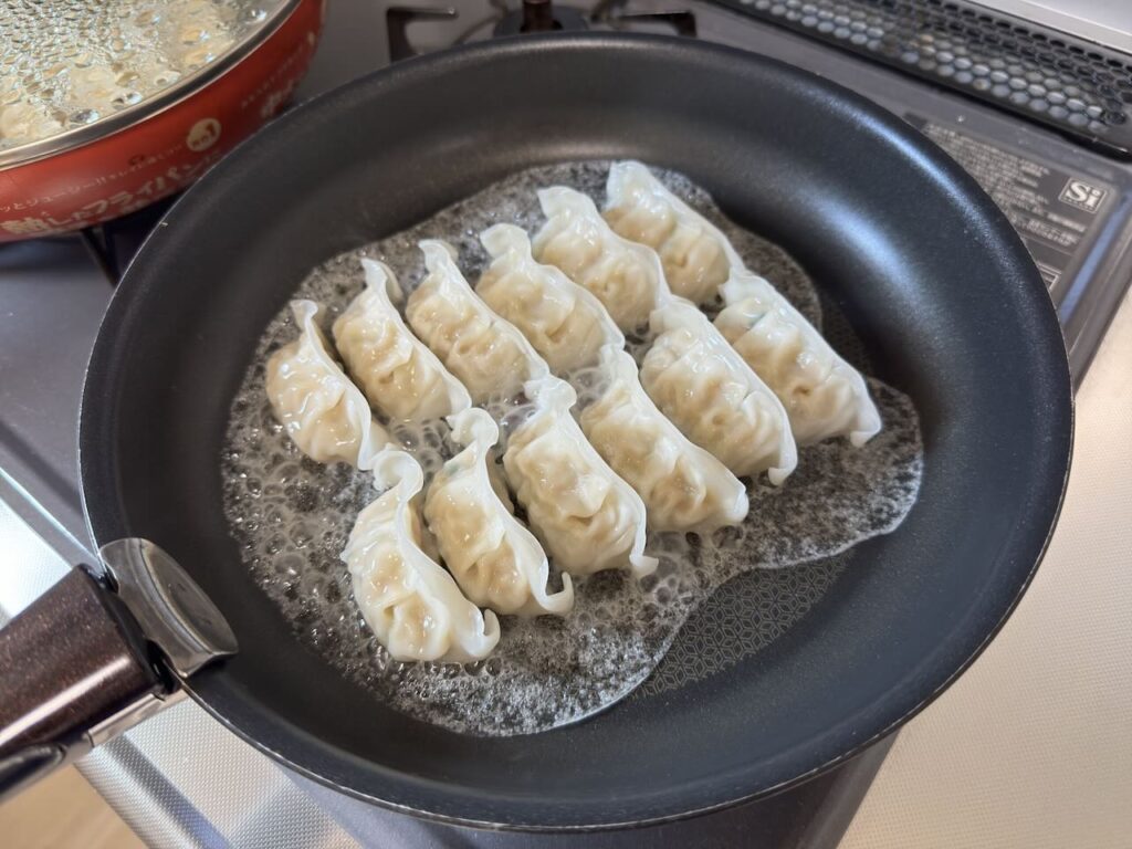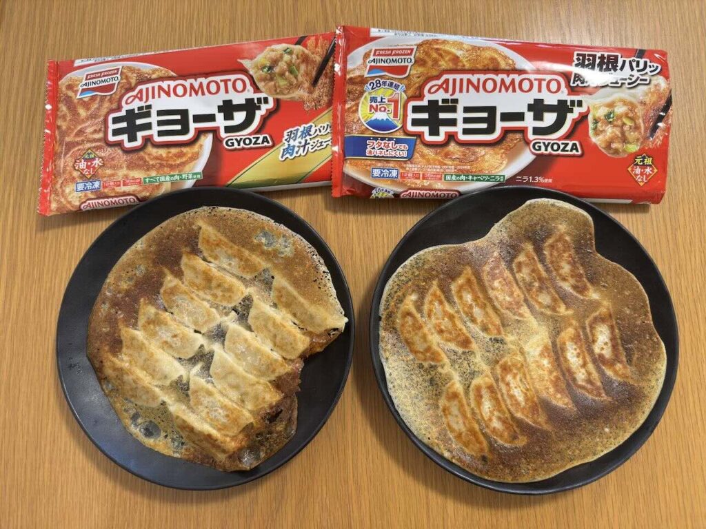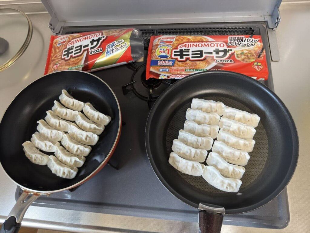今回、新・旧のギョーザをそれぞれ焼いて比べました。新ギョーザはフタなしで、旧ギョーザはフタありで調理しました。