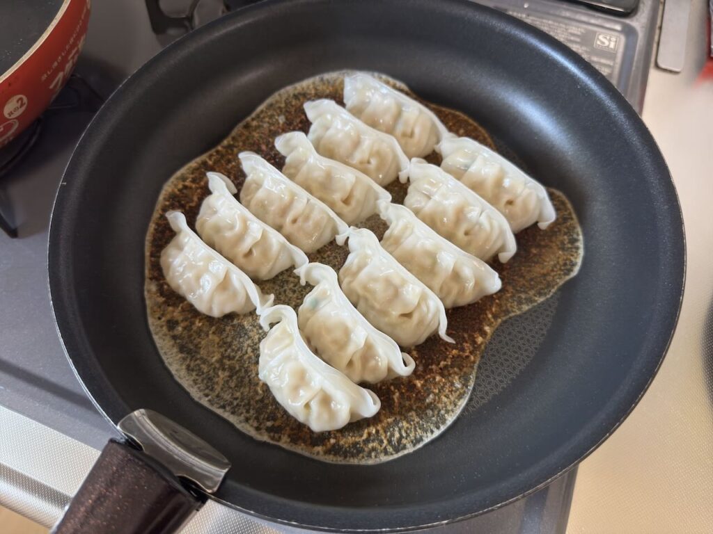 新ギョーザはフタなしで中火にかけましたが、今回のリニューアルのこだわりが「フタなしでも油ハネを抑えること」でしたが、油ハネがまったくしませんでした。後片付けやキッチンまわりの掃除の手間が少なくて済む点は嬉しいですね。あと通常はフタをとってからの焼き加減が難しく、焼き目が薄すぎたり、反対に焦げてしまったりするのですが、フタなしの場合は徐々に加熱されていくので、焼き上がりがより簡単になったと感じました。
