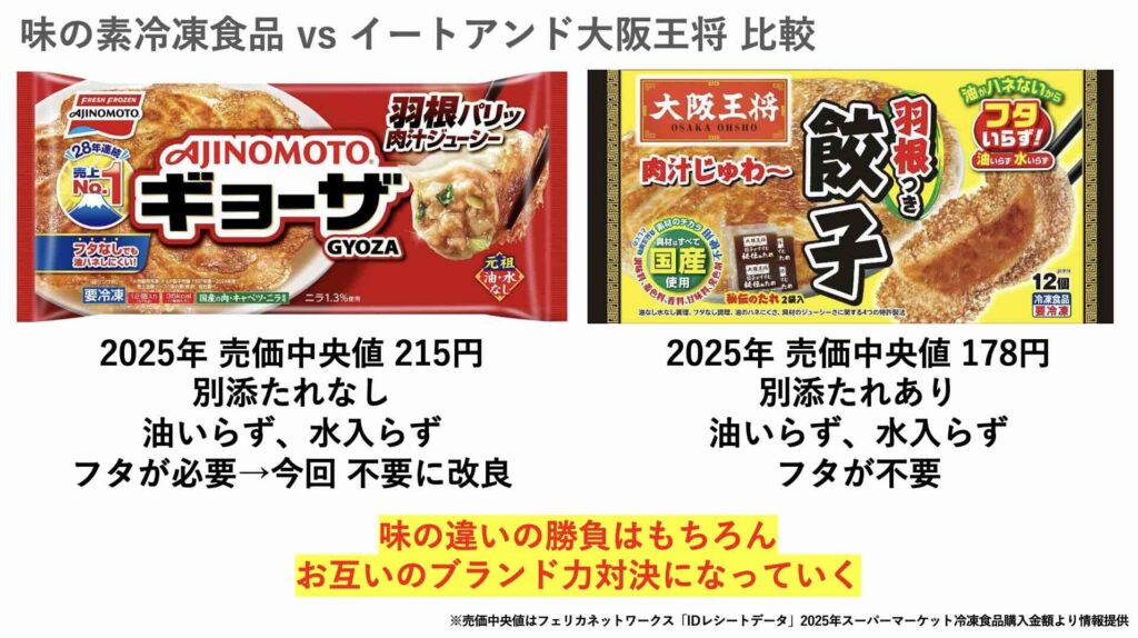 冷凍食品の販売単価はお店によって異なりますが、フェリカネットワークス「IDレシートデータ」によると2025年の売価中央値は「味の素 ギョーザ 215円」「大阪王 将羽根つき餃子 178円」で大阪王将の方が安いお店が多いようです。さらには大阪王将は別添のたれがついているので、条件だけを見ると大阪王将の方が有利な点が多いです。今回は味の素がフタなし調理になることで、条件は近づき、今後は「おいしさ」と「ブランドイメージ」による戦いになっていくと思います。