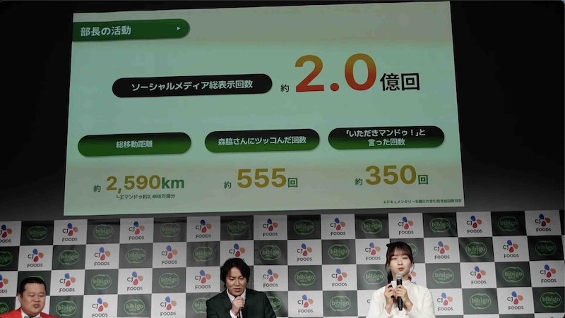 プレゼンテーションでは、YouTube企画のソーシャルメディア総表示回数は約2億回、これまでプロジェクトにかけた総移動距離2590km、森脇さんに突っ込んだ回数約555回、「いただきマンドゥ」と言った回数約350回など、ユニークなデータを次々と公開。