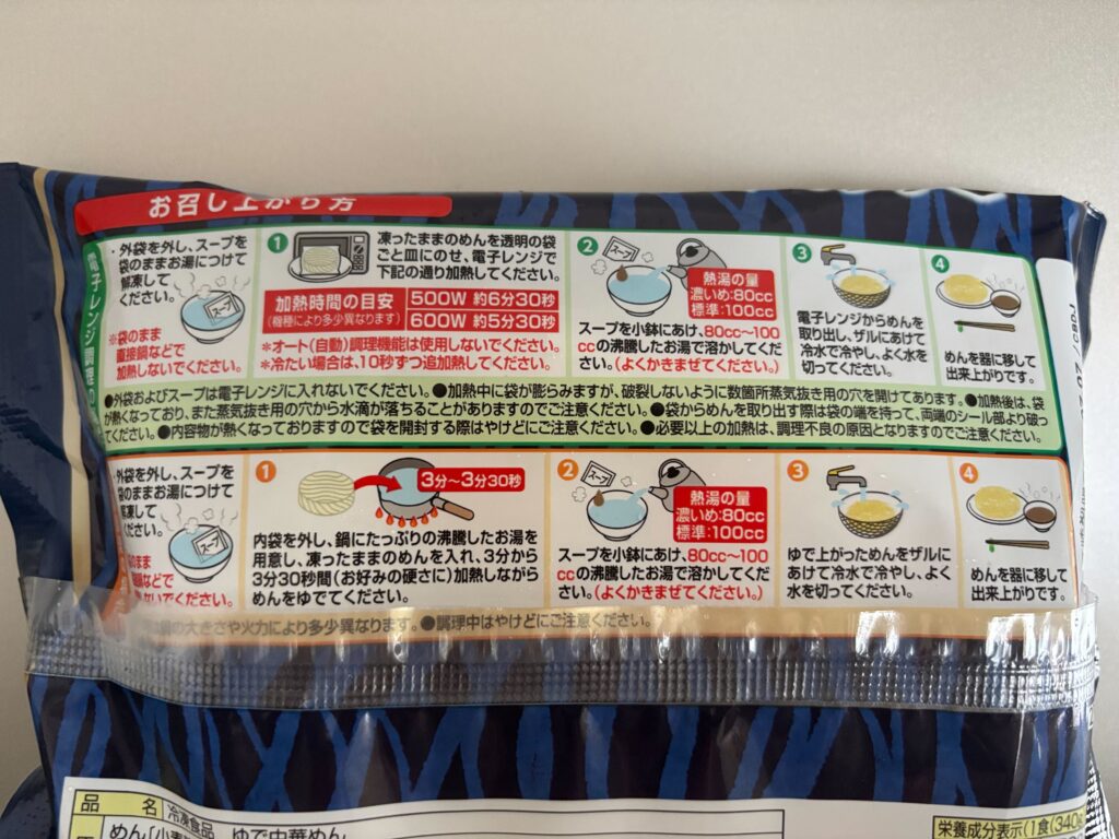 液体スープを湯煎で温め、麺は袋のまま皿に乗せてレンジでチン。500Wで約6分30秒、600Wで約5分30秒チンすればOK。スープは小鉢に開け、80ccから100ccのお湯で溶かせば完成だ。