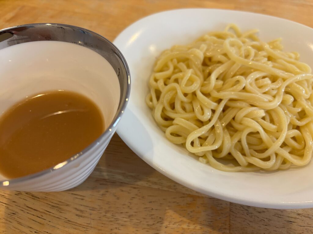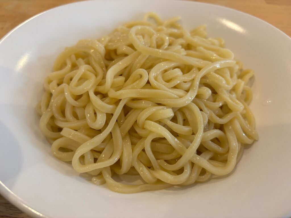 濃厚に仕上げたい場合はお湯を80cc程度にとどめるのがよい。極太の麺にしっかりとタレが絡んで美味しい。