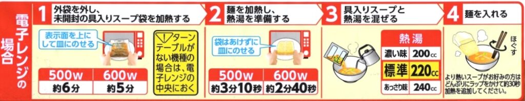 このような調理方法でしたが、スープを電子レンジで加熱し、終わったら今度は冷凍麺を加熱し、電子レンジを2回使用する必要がありました。利用者の意見を聞くとこの調理手順が手間だという意見が多かったため(私も思っていました)、これを改善することになり、約3年かけて改良しました。