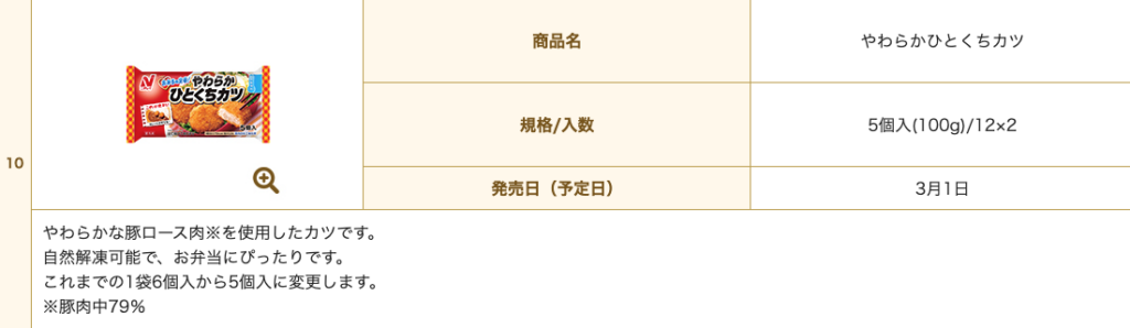 この商品および「やわらかひとくちカツ」「三代目たいめいけん監修カレーコロッケ」がこれまでの1袋6個入から5個入に変更になります。背景としては、冷凍食品全般あらゆる要因によってコストが増加し、各社値上げ傾向が続いている状況ですが、このお弁当用冷凍食品のカテゴリーは値上げが特に消費者に受け入れがたいと考えられています。そのため、1袋あたりの個数が減るリニューアルが各社行われています。一部の商品は大手小売店などで販売されている「留型NB品(メーカーブランドのパッケージだが特殊な規格商品)」ではすでに個数が少ない商品もありました。お弁当用冷凍食品は長年、安売りによる集客の目玉商品としての位置付けが強く、冷凍食品の中でも低価格路線のカテゴリーでした。そのため、値上げではなく1パックの販売単価を上げないように数量を減らす対策が各社多く取られています。