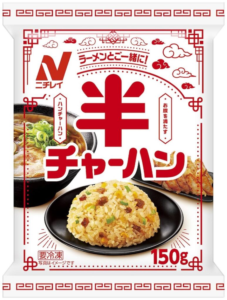 少量ニーズに応えた冷凍炒飯。ラーメン店・中華チェーン店ではよく見られる半チャーハンです。少量ながらも味は本格的で、ニチレイの三段階炒め製法によりレンジでパラパラに香ばしく仕上げています。麺商品と一緒に食べてもよしの150gの少量タイプです。