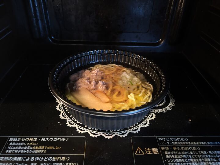 ラップをかける必要はなく、そのまま電子レンジに入れて加熱する。500Wなら7分半、600Wなら6分半で完成だ。加熱が終わったら取り出してよくかき混ぜると、濃厚な味噌スープが全体に行き渡り、あっという間に完成する。