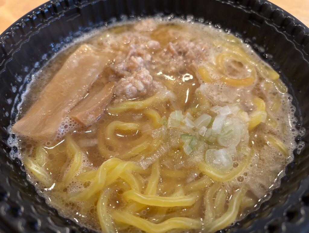 具材はネギやタマネギに加え、ひき肉やメンマも入っている。