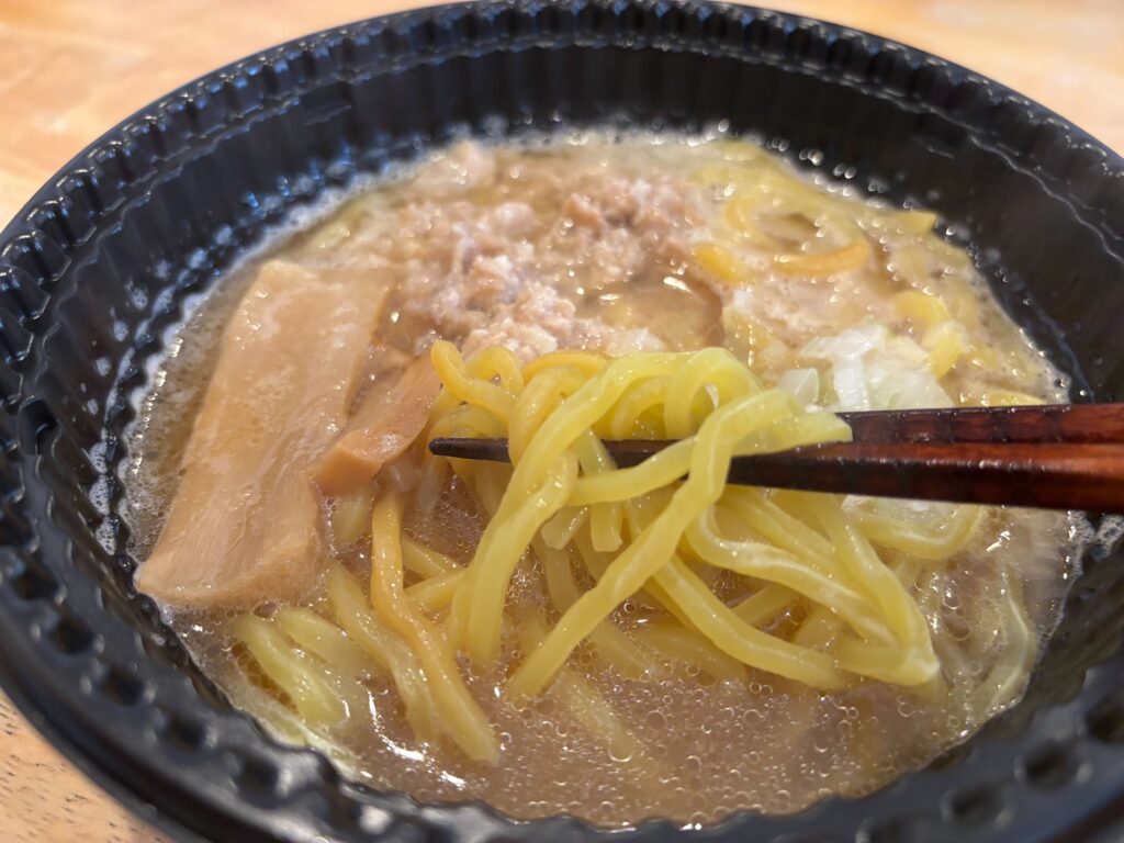 香ばしい味噌の香りに、野菜を炒めた甘みとニンニクと生姜の香りが立ち上る。レンジ調理とは思えない本格的な香りだ。表面にはラードがうっすらと油膜を張り、スープの濃厚さを予感させる。