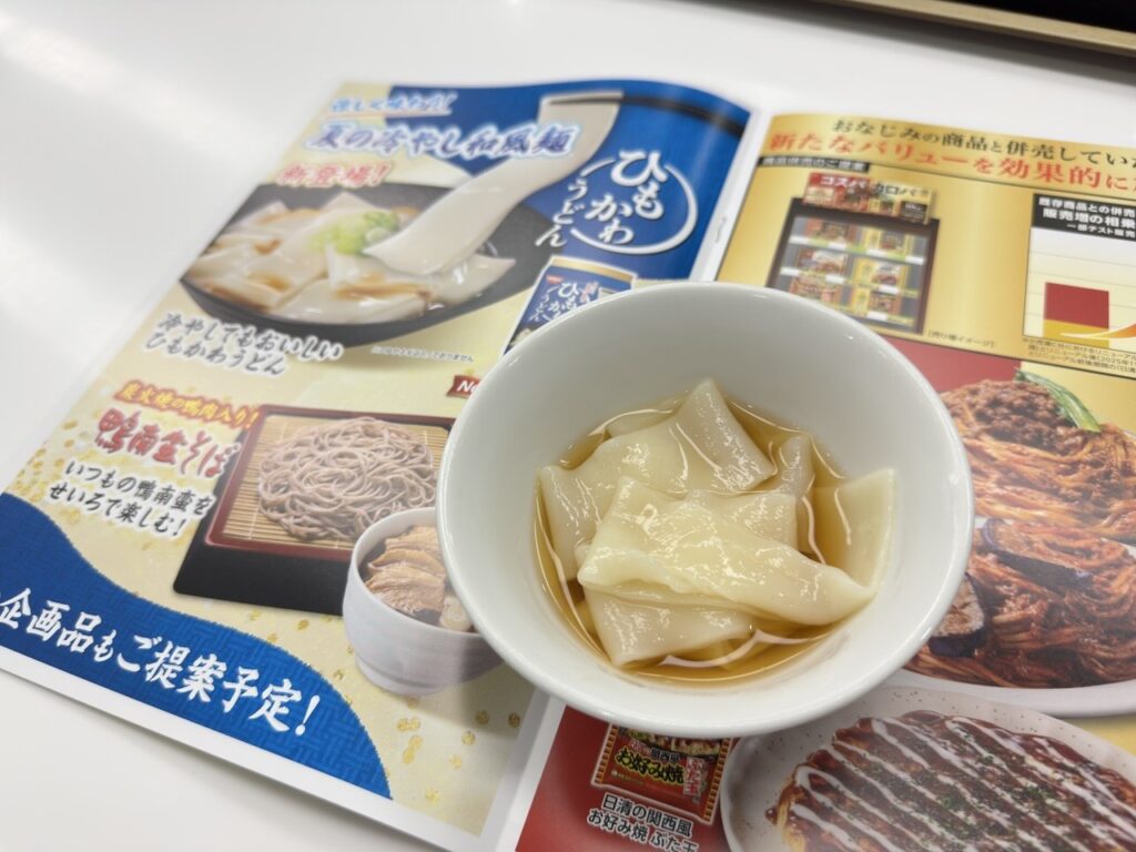 麺のみの冷凍うどんの新商品です。”ひもかわうどん” は群馬県のご当地麺として知られ、もちもちとした食感と食べ応えのある幅広麺で、今回このひもかわうどんを商品化しました。インパクトのある横幅約3cmの幅広麺は、つるっとしたのどこしと、もちもちとした食感が特長で、麺の存在感がすごいです。冷たいキリッとした麺つゆと合わせると、この麺の美味しさを堪能できます。近年は記録的な猛暑を背景に、家庭で冷たい麺料理を楽しむ方が増えています。猛暑対応の冷凍食品が今後盛り上がりますね!温かいつゆでも美味しいと思うので、夏だけでなく通年定番品として売場に置かれるといいと思います。