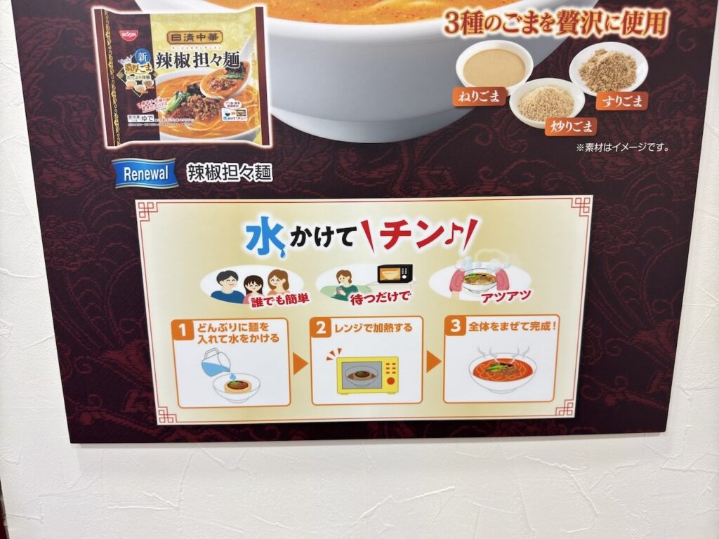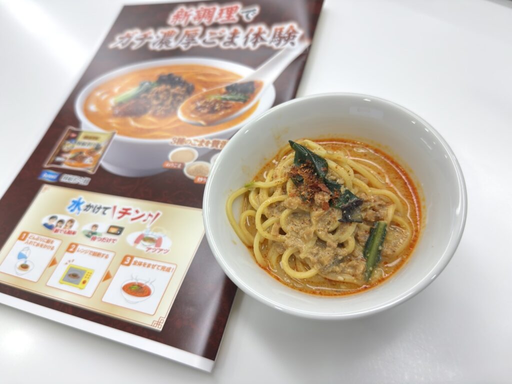 調理が簡単なだけでなく、電子レンジ直後に食べることができるので、「アツアツ」な一杯を楽しめる点も良いです。さらにスープに使用しているねりごまとすりごまを増量したそうで、濃厚な味わいをより堪能できますね。