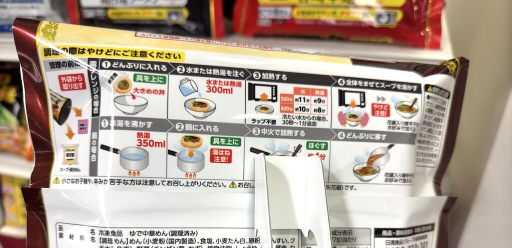 今回は調理方法に大きな変更がありました。今回のリニューアルでは、従来のお湯をかける調理方法から、濃縮スープと具付きの麺に「水」をかけて電子レンジで温めるだけの簡単調理に一新しました。今までは電子レンジ調理+お湯を沸かす、という2つの工程がありましたが、お湯を沸かす必要がなくなり、電子レンジ調理だけで済むことで調理工程が減るので、大変ありがたい改良ですね。この調理方法は前回の2025年9月発売の新商品「冷凍 今日はこってり 鶏白湯ラーメン」「冷凍 今日は旨辛 宮崎辛麺」にて採用された方法で、今回定番商品で人気の辣椒担々麺にも採用されました。