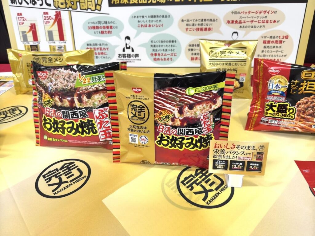 「完全メシ」は、「日本人の食事摂取基準」で設定されたビタミン・ミネラルなど33種類の栄養素とおいしさの完全なバランスを追求したブランドです。2022年5月に発売し、シリーズ累計出荷数は5800万食を突破しました。「冷凍 完全メシ」は、日清食品の冷凍食品の中でもロングセラー商品を中心に、おいしさそのままに「完全メシ」として楽しめるのがこだわりです。今回はそのラインアップに “お好み焼” が新しく加わります。