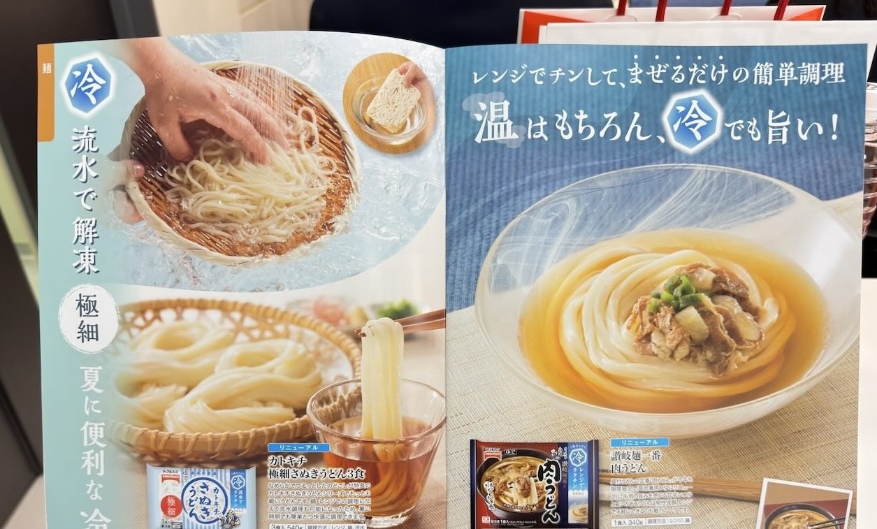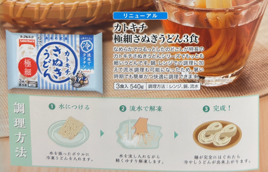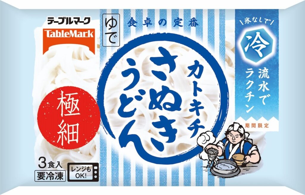 こちらは既存品でパッケージ変更のみになりますが、夏に向けて冷たく仕上がることをアピールしたパッケージになりました。この商品は温かいうどんと冷たいうどん、両方楽しむことができる温冷対応になります。