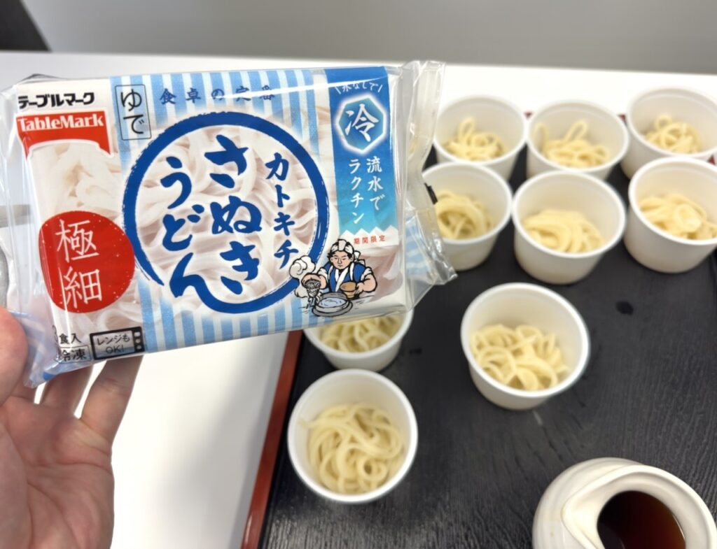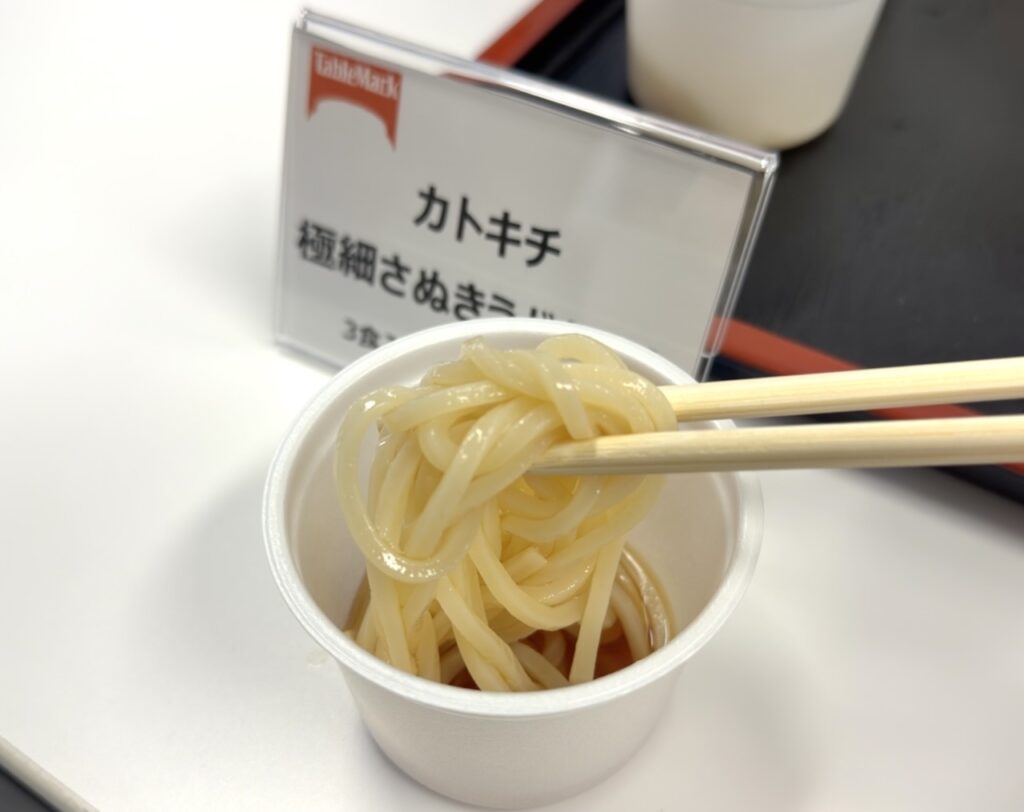 これを冷凍うどん製造工場にて、テーブルマークのあらゆる製麺技術を駆使して実現しました。極細麺が流水解凍には向いていますが、それだけではないこだわりがたくさんあるそうです。「カトキチブランド」冷凍うどんを長年作ってきたテーブルマークが納得できる形、うどんの品位を保つことができたので今回発売することができました。
