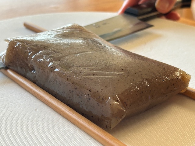 菜箸を添えて包丁を横にスライドすると切ることができます。