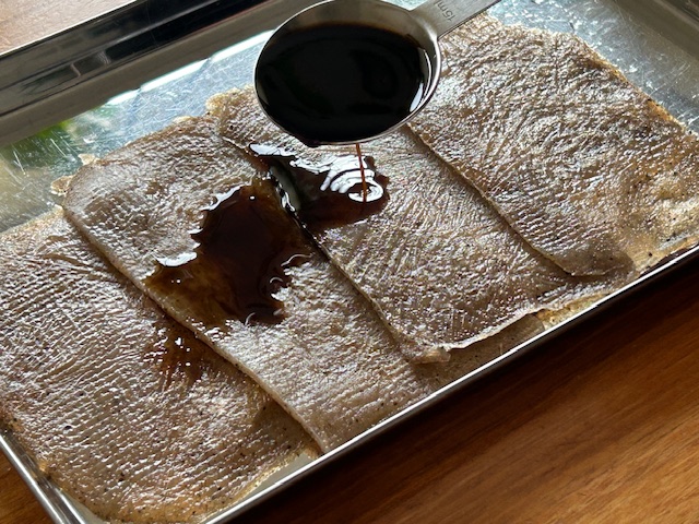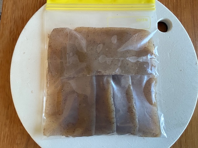 ①冷凍こんにゃくは保存袋のまま、流水解凍します。こんにゃくに残った水分をしっかり絞って、ウスターソースに浸します。