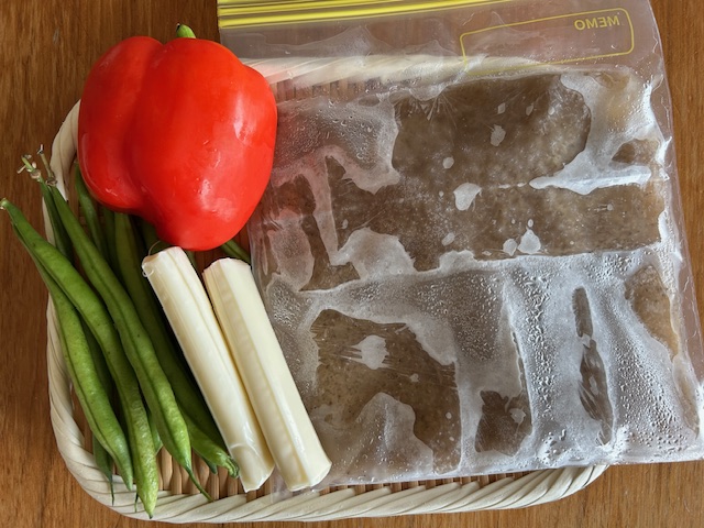 ②パプリカは細切りに、さけるチーズは半分に割きます。いんげんは下茹でします。