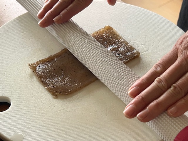 ポイント:解凍後のこんにゃくにはアクが残っているので、しっかり絞ります。今回はめん棒を使って絞りました。絞るときに中の水分が飛び出してくるので、キッチンペーパーに包むと上手に絞ることができます。その後、ウスターソースでしっかり味をしみこませると、アクは全く感じません。