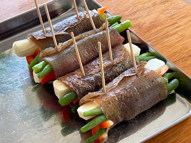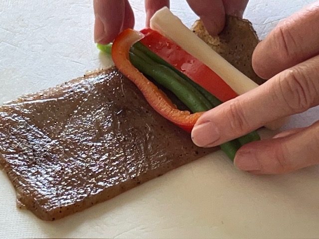 ③軽く水けを切ったこんにゃくに、赤パプリカ、いんげん、さけるチーズをのせて巻き、つまようじで止めます。