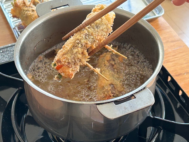 ④③に薄力粉、といたたまご、パン粉をつけ、180度に熱した油で色よく揚げます。
