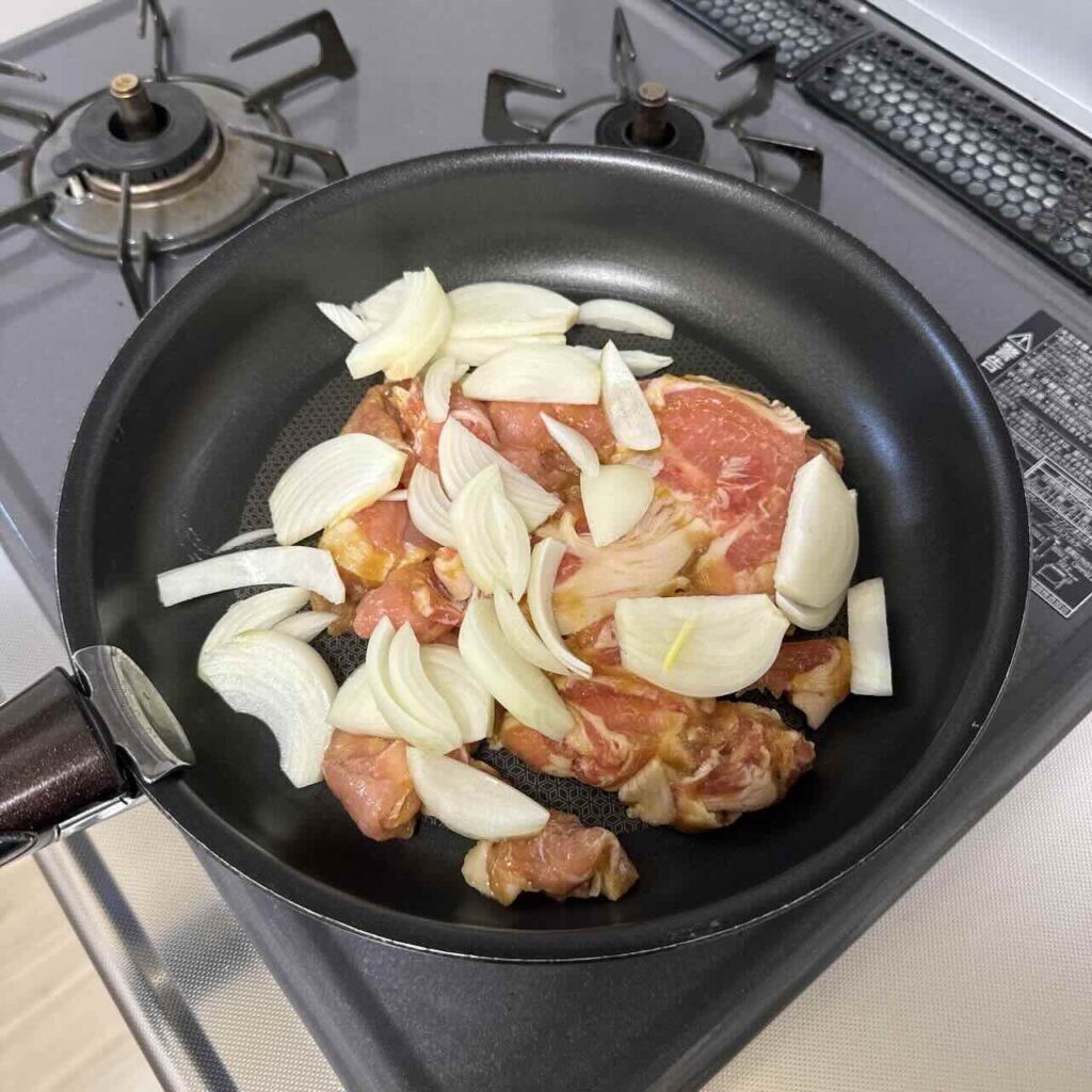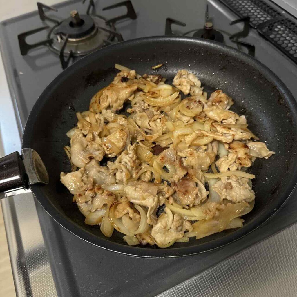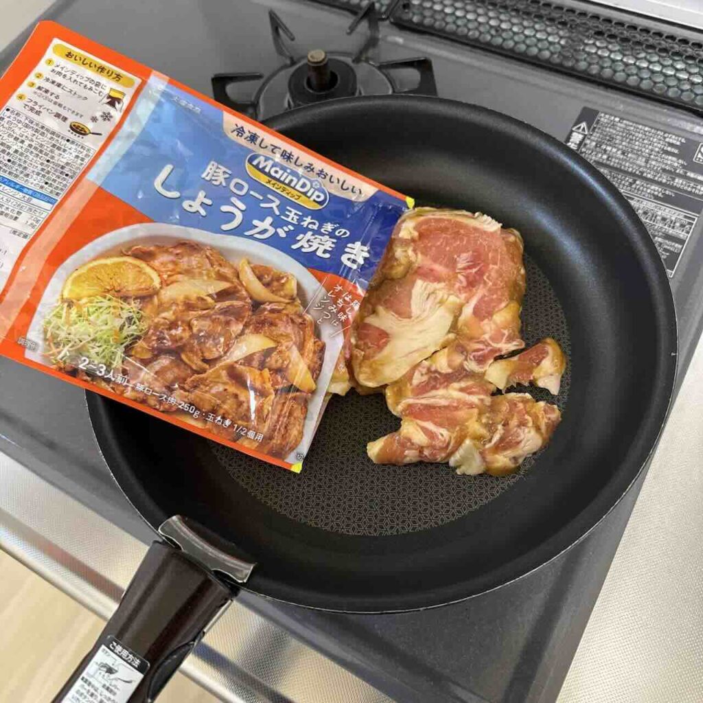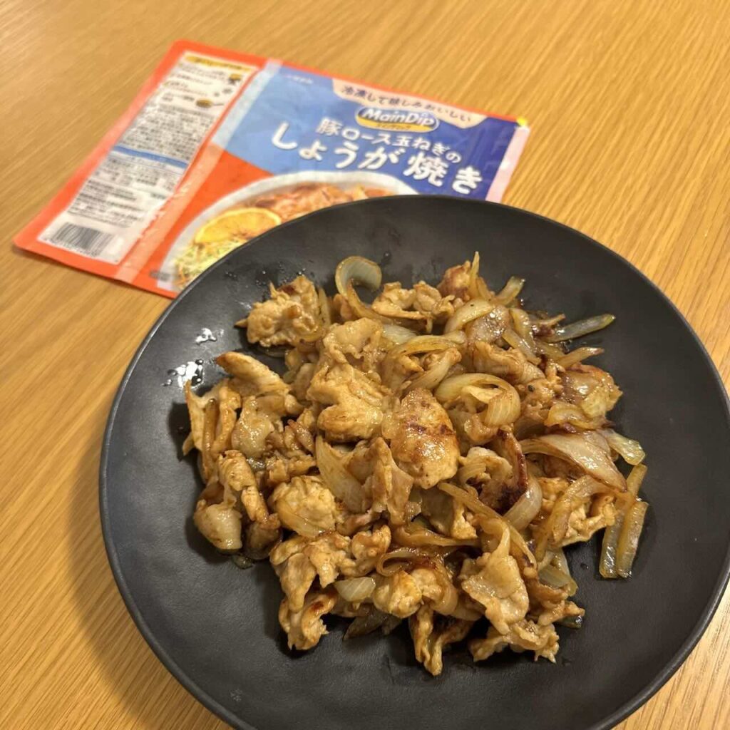 豚肉を下味冷凍する「豚ロース玉ねぎのしょうが焼き」商品も試しました。豚肉商品の方はフライパン調理時にフタは不要という調理方法でした。豚肉は鶏肉よりも薄いので、フタなしでも火が通りやすいためだと思います。その分、しっかり解凍してから調理をしないと、凍ったままだと肉同士が張り付いてしまうので、炒めにくくなるので、注意が必要です。味はオレンジの風味が効いていて、家で普通に作るしょうが焼きとは違ったオシャレ感が増していましたね。豚の脂が出てくるので、規定より玉ねぎをもっと増やしたり、他のカット野菜を増やしても良いと思いました。