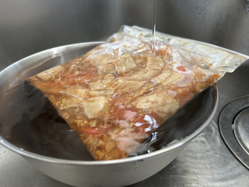 トマトは冷凍すると繊維が壊れて、解凍した時に、ソースのベースとなる味に。また、冷凍している間に、干し椎茸、大豆ミートは柔らかくなり、旨味もソースに溶け込みます。