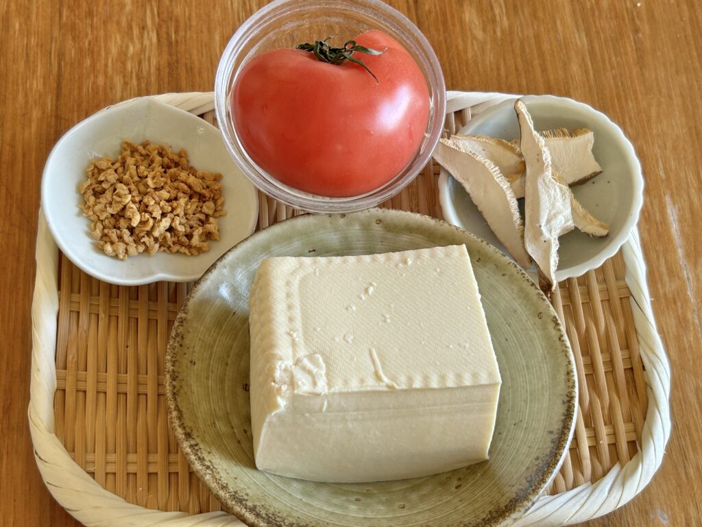 ①木綿豆腐、トマトは1.5cm角に切ります。干し椎茸は、ハサミで細かく切ります。