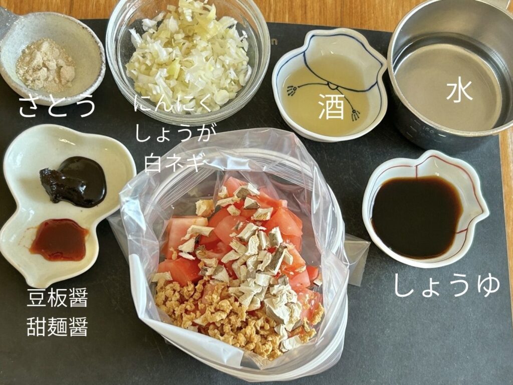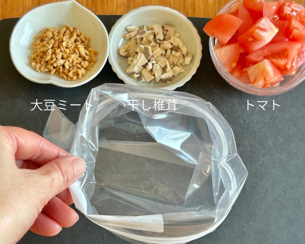 ②フリーザーバックにトマト、干し椎茸、大豆ミート、Aを入れて揉みこみます。