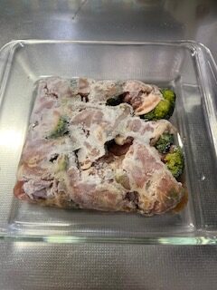 ②さらに電子レンジで4~5分加熱してお肉をひっくり返して、更に4~5分程加熱してお肉の色が白く変わっていることを確認する。