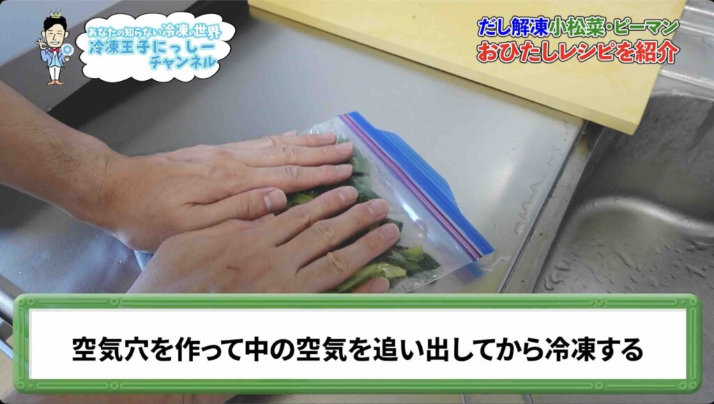 野菜をきれいに洗って食べやすいサイズに切ったら、冷凍用保存袋に入れて平らにして空気を抜き、冷凍庫に入れて凍らせておきます。