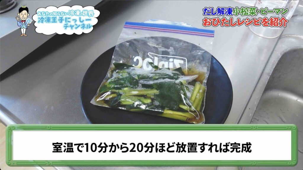 だし解凍のやり方は、本当にシンプル。袋に入った冷凍野菜に液体調味料を注いで、しばらく放置しておくだけです。火も使わず、電子レンジも使わず、ほったらかしで一品できてしまいます。