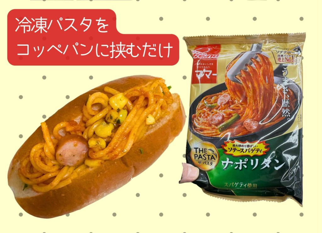 温めた冷凍パスタを、そのままコッペパンに挟むだけ。
