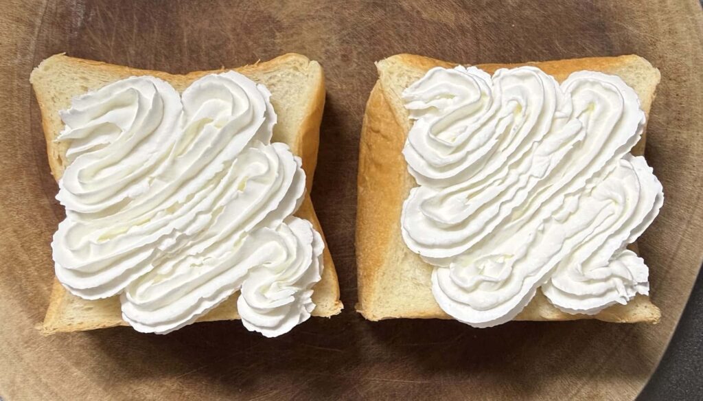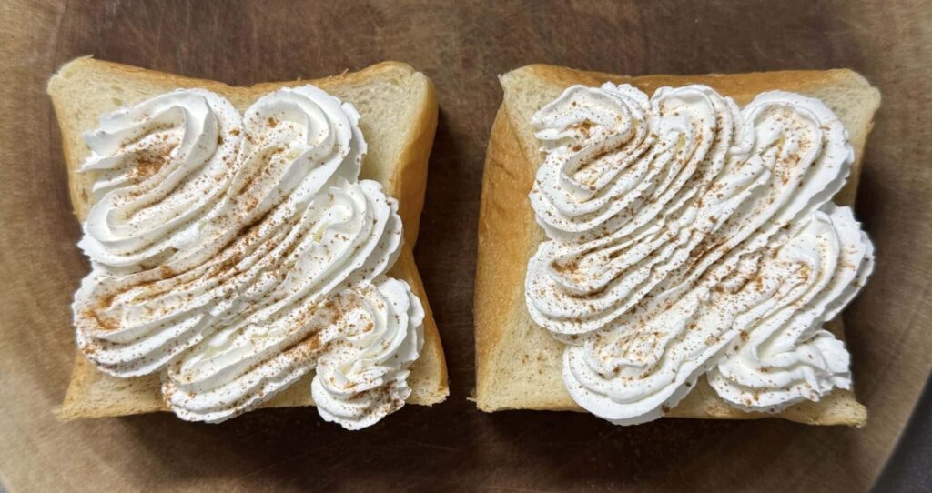 ②食パンにホイップクリームを絞り、シナモンパウダーをふる。