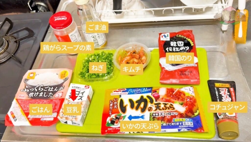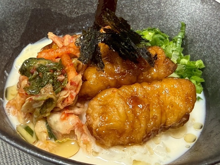 いかの天ぷら、キムチ、豆乳で、お茶漬け!!