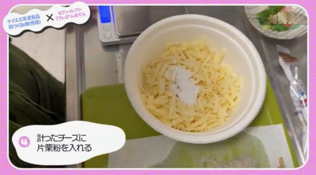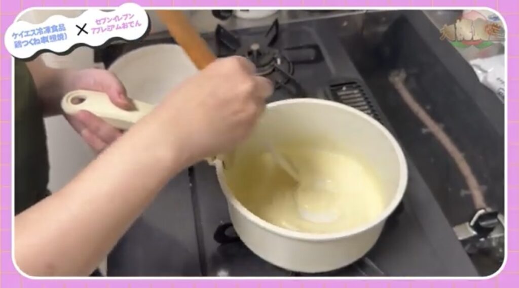 ④ピザ用チーズに片栗粉をまぶして、火を止めた鍋に少量加えて混ぜながら溶かし、残りのチーズを入れて同様にし、弱火でトロトロになるまで混ぜる。
