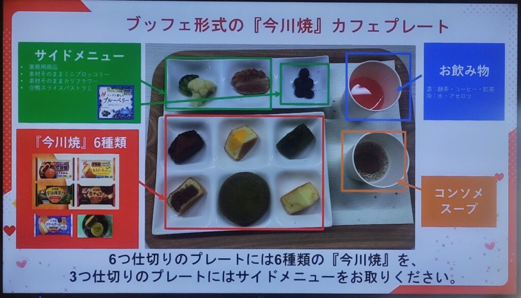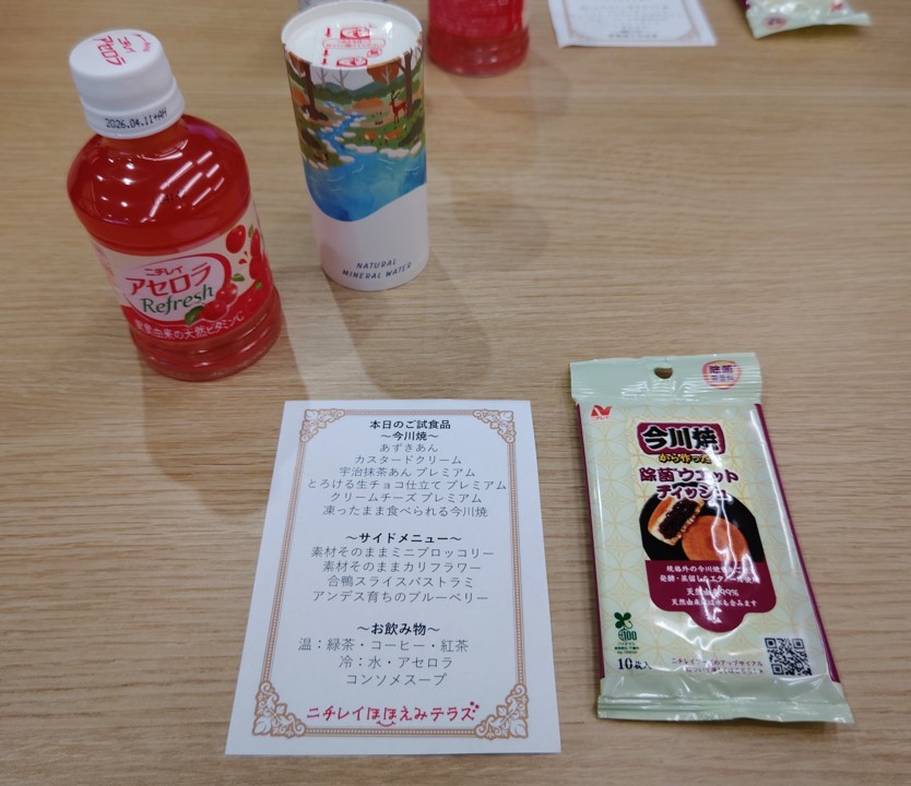 会場では5つのグループに分かれて席に着きました。テーブルには試食のメニューリストと今川焼パッケージのウェットティッシュ、アセロラジュース、ミネラルウォーターが置かれていました。
