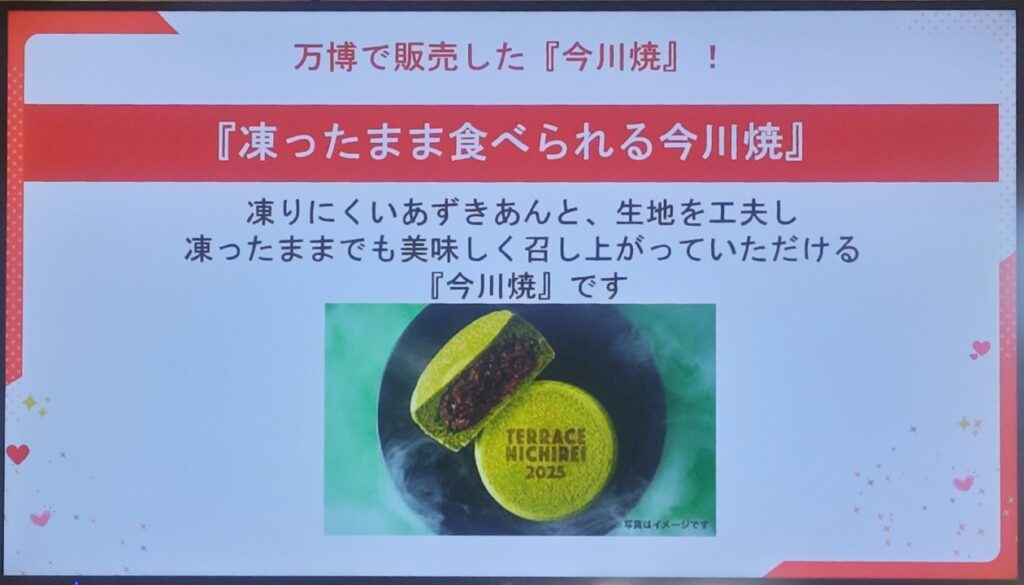 サプライズは、今年の大阪・関西万博のテラスニチレイで提供されていた「凍ったまま食べられる今川焼」が登場! まさかここでいただけるとは幸運でした。