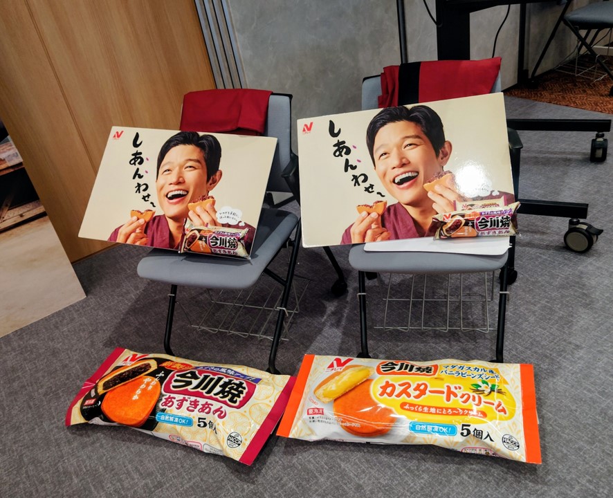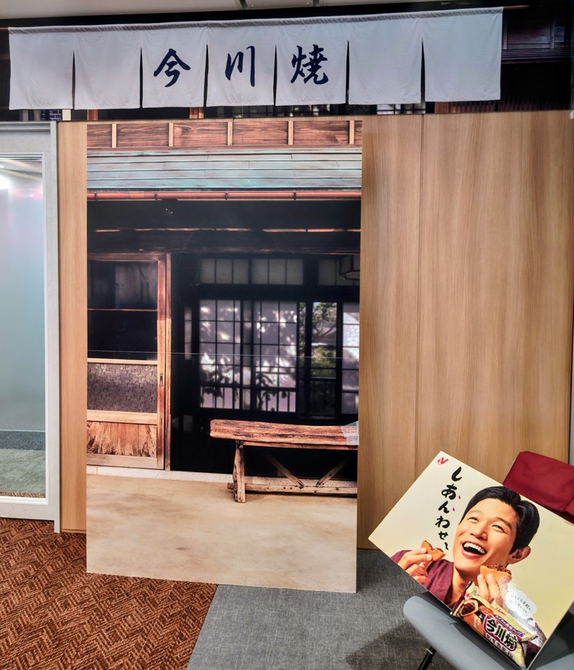 会場に入ってすぐのところに、現在CMに出演されている鈴木亮平さんが美味しそうに食べているボードと、CMのロケーションをイメージしたフォトスポットが設置されていました。法被や今川焼の大きなパッケージのクッションも用意されており、参加者の方々が大喜びで撮影されていました。