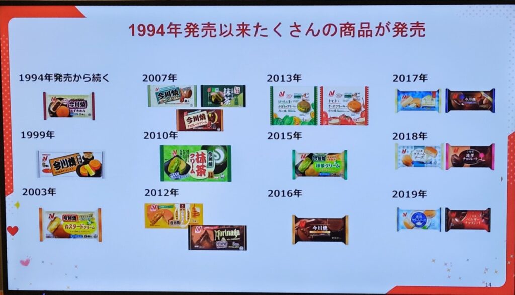 次に今川焼の歴史や開発の裏側のお話や、工場での製造工程の動画などを見せていただきました。