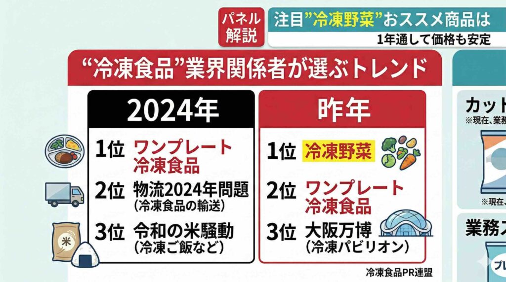 「冷凍食品トレンド大賞」とは、冷凍食品業界の関係者を対象としたアンケート調査の結果をもとに、世間で話題となっている冷凍食品関連のワードをランキングにしたものです。