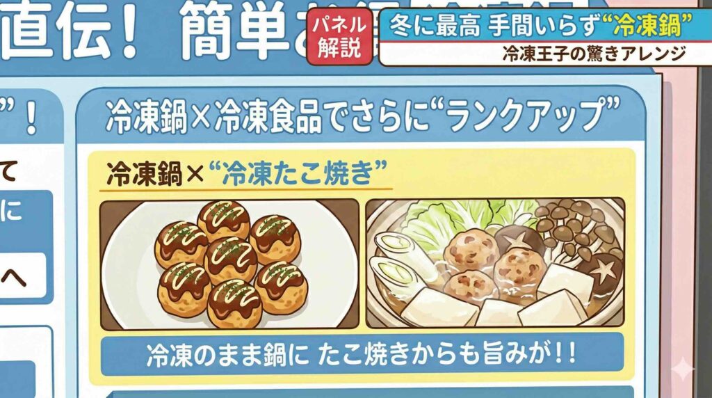これにはMCの石井裕二さんが「ええーーー???」とリアクション、他の出演者の方々も誰も信じていない様子でしたが、実はたこ焼きを出汁と一緒に食べるという形式は、明石焼きに似ているので、お鍋に冷凍たこ焼きはおすすめです! だしをしっかり吸い込んで、ふわふわ食感になったたこ焼きは美味しいです。