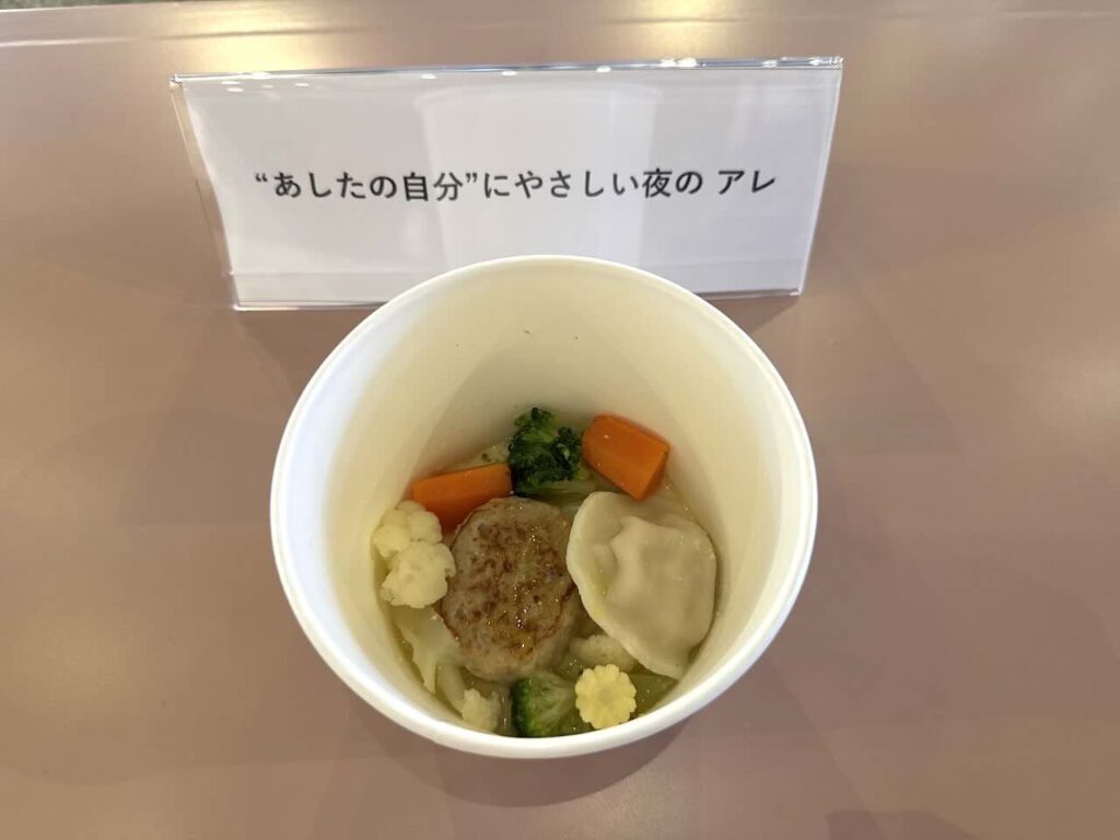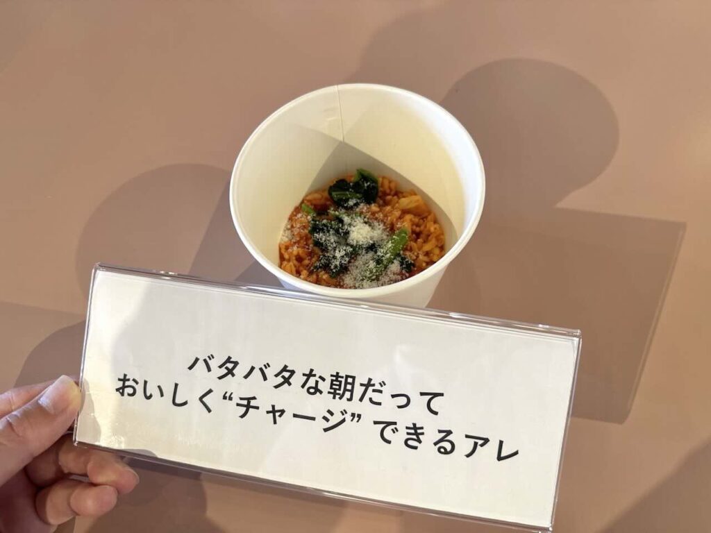 大友さんは朝のリゾットと夜のスープの2品を実食。「朝のリゾットは、チーズがとろけてほっとするやさしい味です。食欲がない朝でも食べてシャキッと元気になれる!」と絶賛。続けてスープについても「本格的なポトフの味。餃子とハンバーグが入っていて、食べ応えがあってすごくおいしいです」と笑顔で語りました。